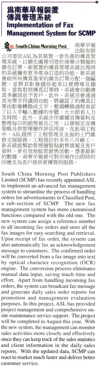 南華早報出版有限公司委託ASL裝置一套先進的傳真管理系統